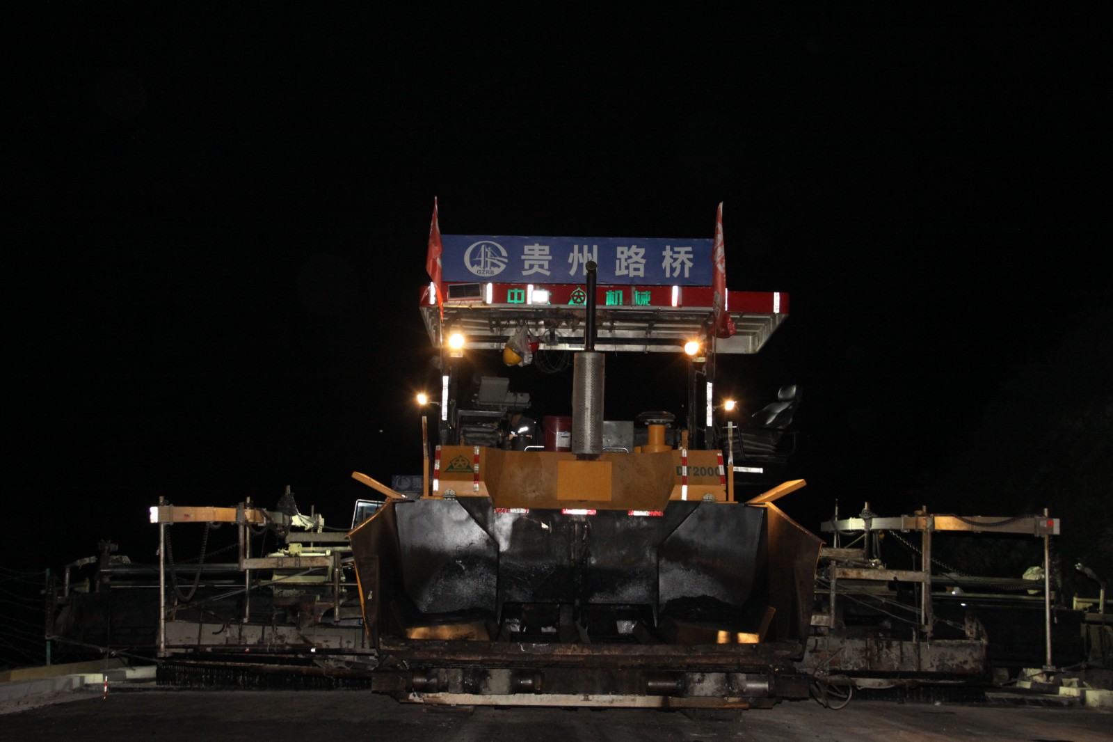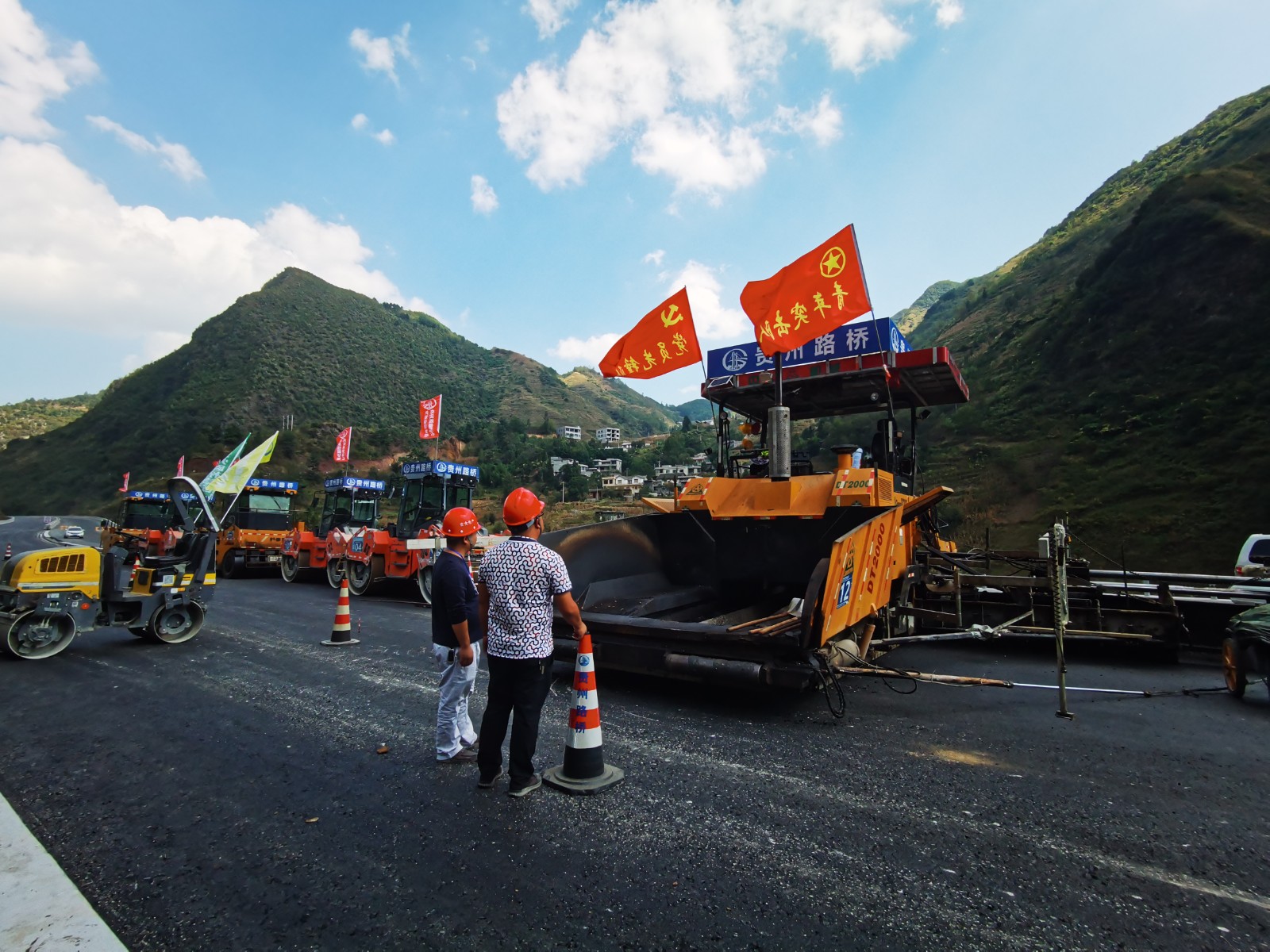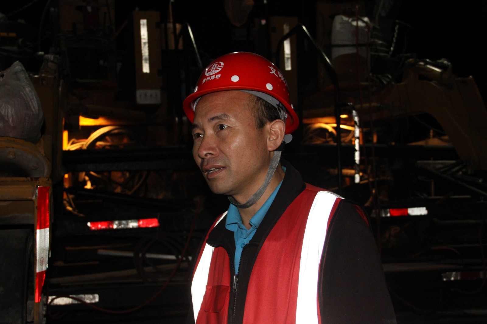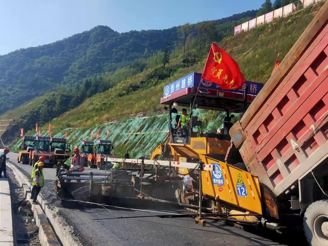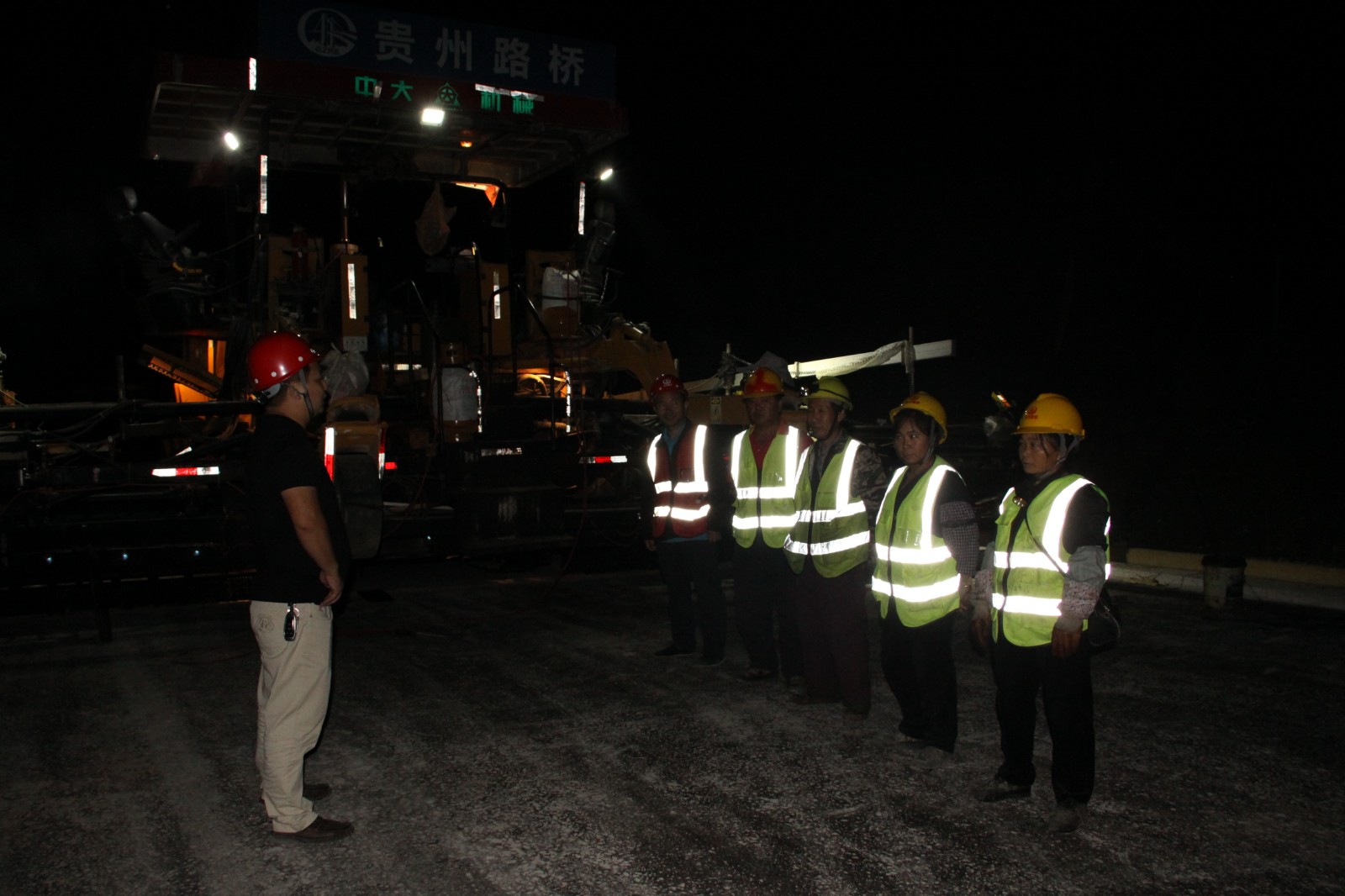 10月2日晚上10点,赫章的气温只有20℃。在镇赫路面项目现场,一台大型摊铺机正紧张地进行着沥青摊铺工作,机械隆隆作响,工人往来忙碌,一派热火朝天的景象。