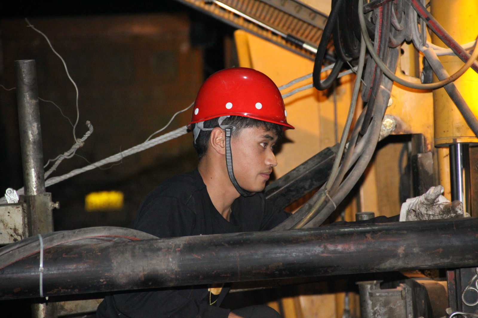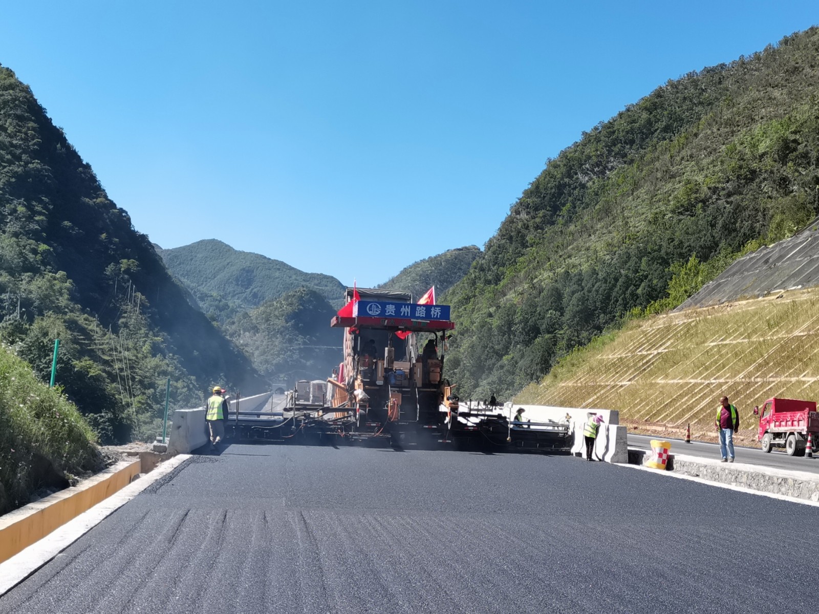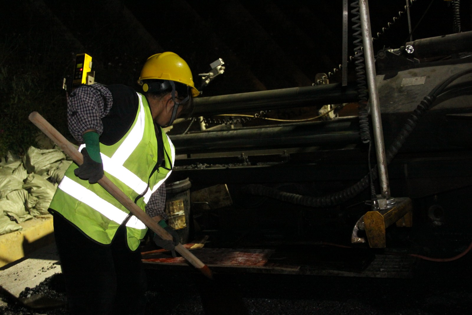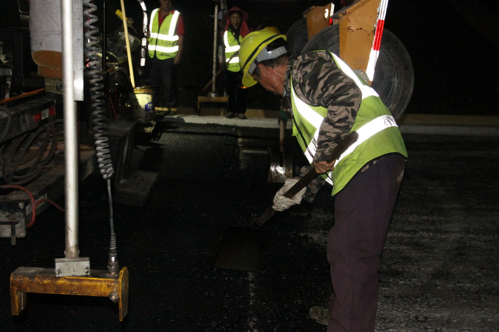 10月2日晚上10点,赫章的气温只有20℃。在镇赫路面项目现场,一台大型摊铺机正紧张地进行着沥青摊铺工作,机械隆隆作响,工人往来忙碌,一派热火朝天的景象。